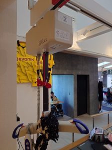 デーセンター夢飛行では、施設入り口から浴槽まで天井走行リフトで移動が可能です。新しいリフトでこれまで以上に安全、安心な移動をお心がけます!(Z)